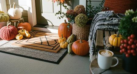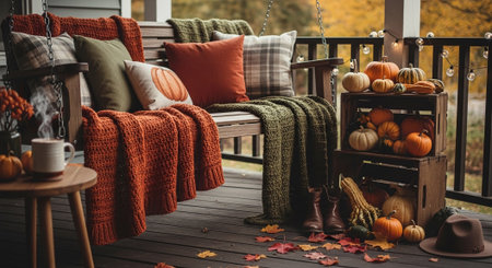 Autumn cozy terrace with pumpkins, cushions and knitted blanket