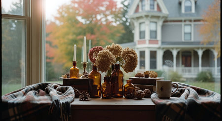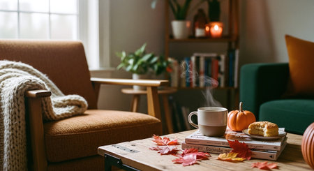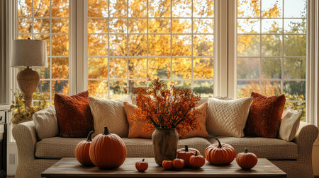 A cozy living room scene featuring a coffee table with pumpkins and autumn leaves, a warm knitted blanket draped over a chair, and large windows with fall foliage outside