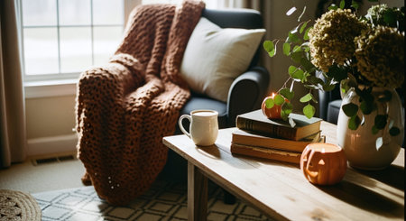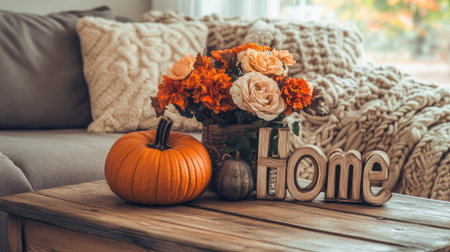 Pumpkins, flowers, and a blanket on a coffee table with a 'home' sign, creating a serene autumnal atmosphere in the living room for cozy evenings.