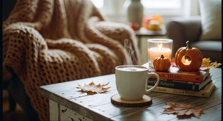 Autumn still life with pumpkins, cup of hot drink, knitted plaid, autumn leaves in cozy living room. Cozy home concept