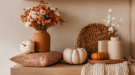 A warm autumn display showcases dried flowers and pumpkins on a shelf adding seasonal charm.