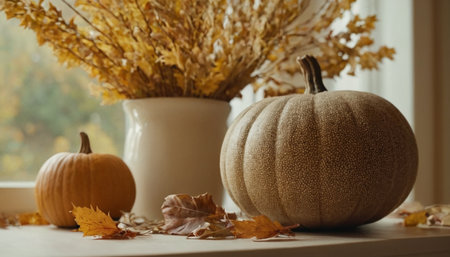 Autumn still life with pumpkins and dry leaves on windowsill