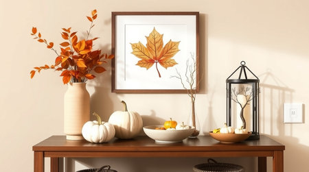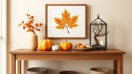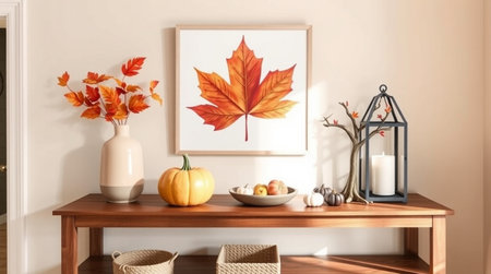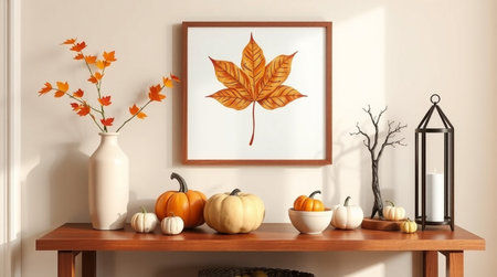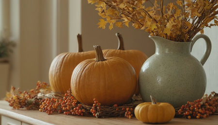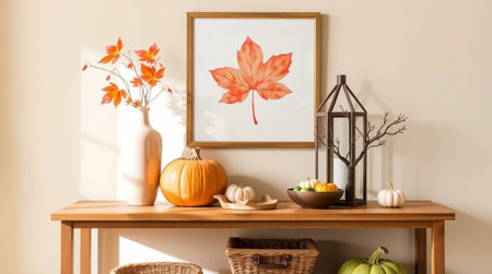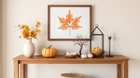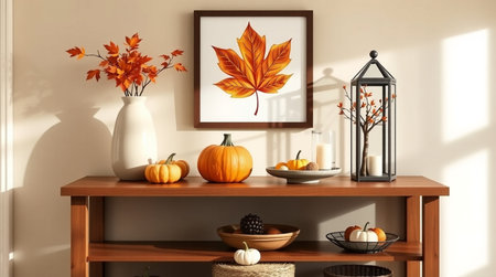 Autumnal scene featuring a wooden table with a pumpkin arrangement, leaf art, and warm lighting.