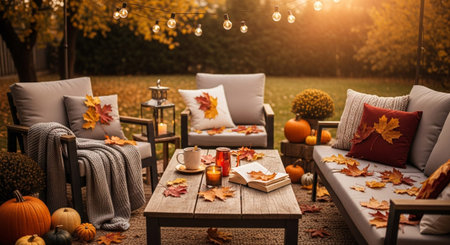 String showing cozy autumn patio furniture arrangement with string lights pumpkins and falling leaves.