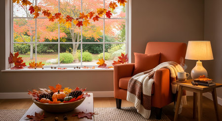 A cozy living room interior decorated for autumn, featuring an orange armchair, warm blanket, and pumpkins. A large window offers a view of vibrant fall foliage, creating a warm and inviting atmosphere.