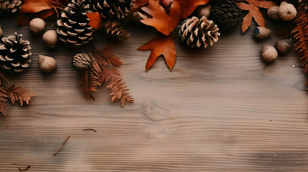 A beautiful autumnal arrangement of pinecones, leaves, and acorns on a rustic wooden surface. Perfect for fall backgrounds.