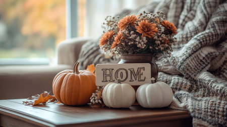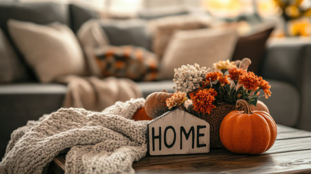 A cozy blanket, pumpkins, and flowers on a coffee table, with a 'home' sign in the center. Perfect autumnal still-life capturing the essence of home warmth.