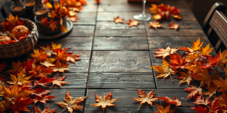 A beautifully arranged scene featuring autumn leaves scattered on a wooden table, creating a warm and inviting atmosphere perfect for fall gatherings.
