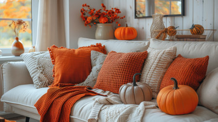 Autumn or fall season. a cozy fall-palette living room interior with various cushions and autumn pumpkin decor