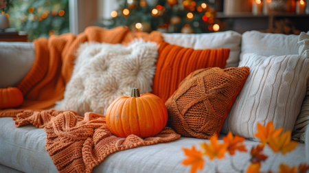 Autumn cozy home interior with pumpkins and warm knitted plaid