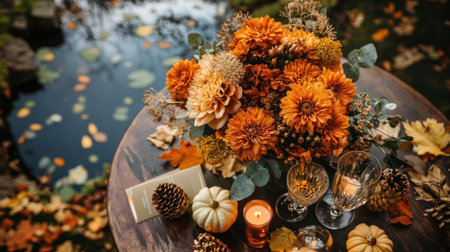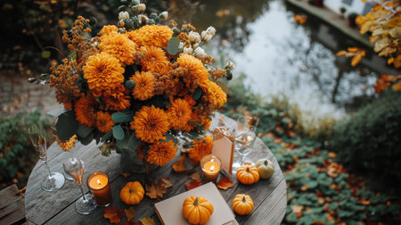 Autumn or fall romantic wedding still life outdoors in park or garden, decorative pumpkins, brides bouquet, invitations and champagne glasses, holiday mood, AI generated