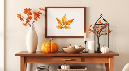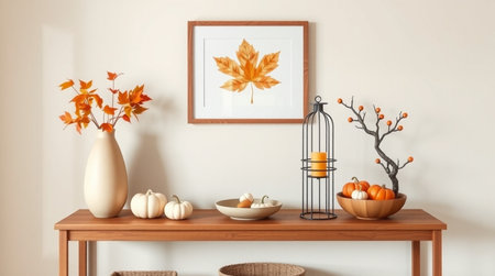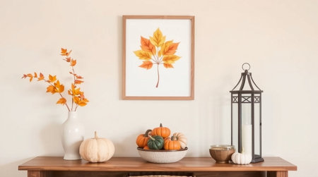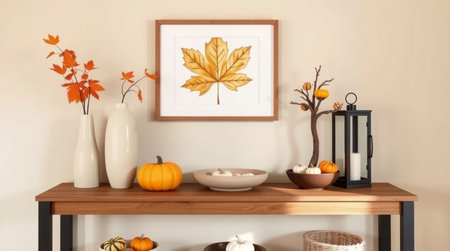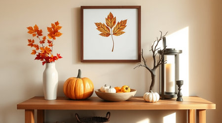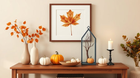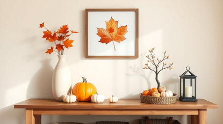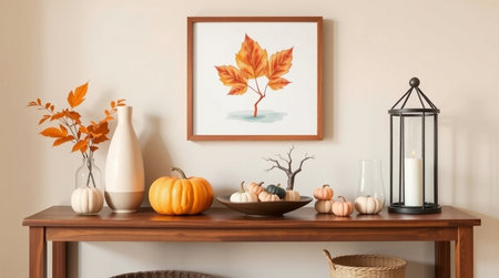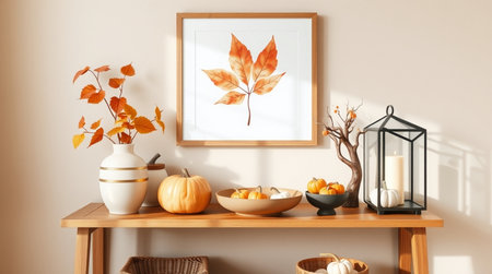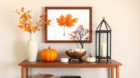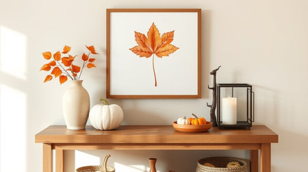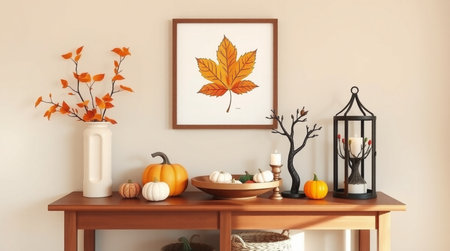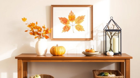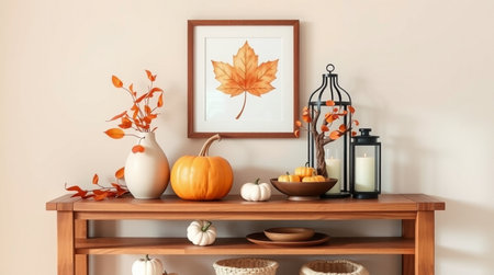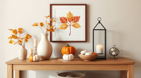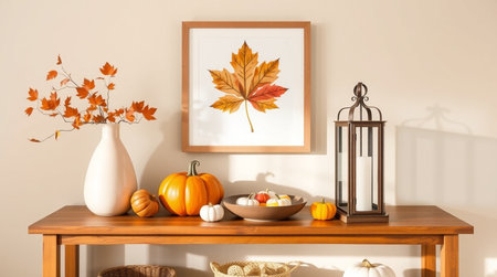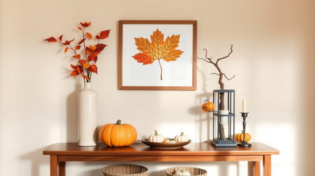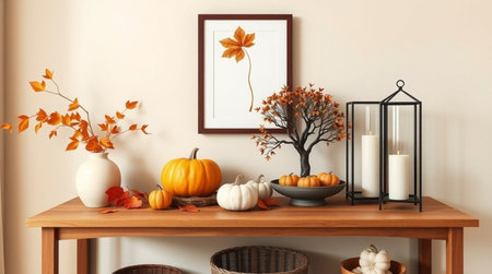 Mock up poster frame with autumn leaves, pumpkins and candlesticks on wooden table. 3d rendering