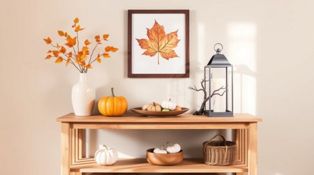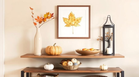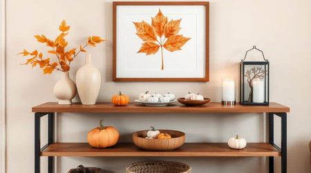 Wooden shelf with pumpkins, candles, and autumn leaves in room