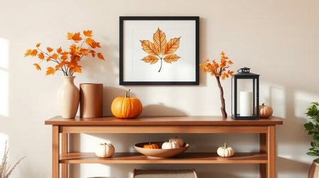 Autumn composition in cozy living room interior with mock up poster frame. 3d render