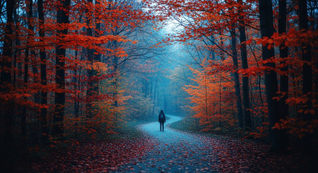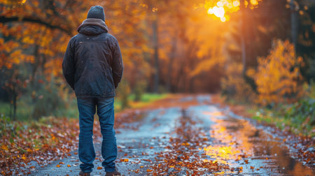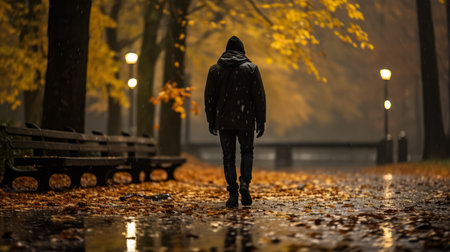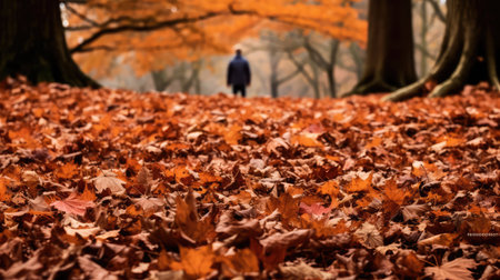 a man walking amidst a serene forest, with the ground blanketed in fallen leaves of vibrant autumn colors. The scene exudes the tranquility of a solitary autumn stroll