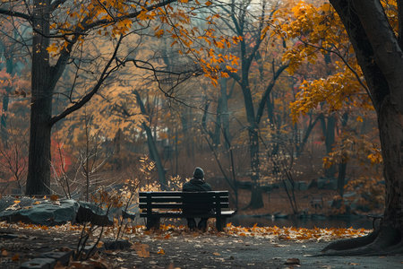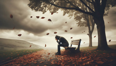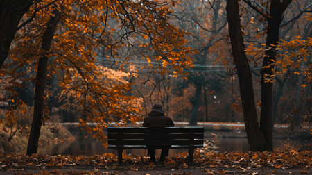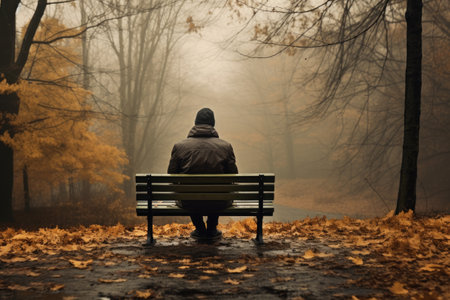 A person sits alone on a bench in a park, surrounded by autumn leaves. The figure is partially obscured by shadows, suggesting loneliness and isolation.