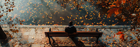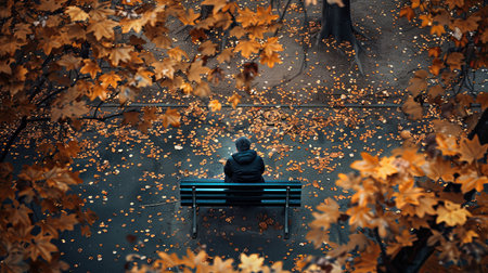A lone person sits on a bench in a park, surrounded by fallen leaves. The image is taken from a high angle, giving the viewer a sense of the persons isolation.