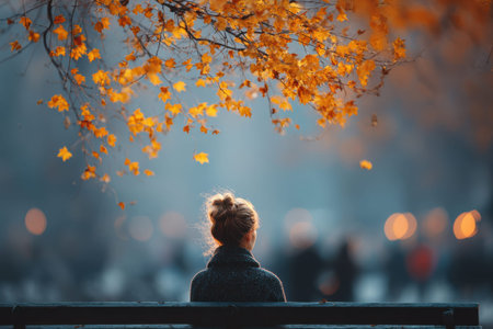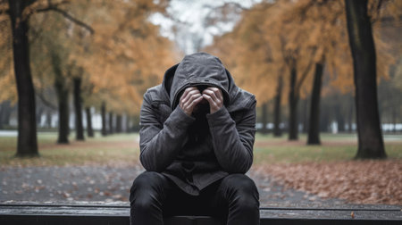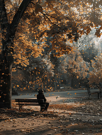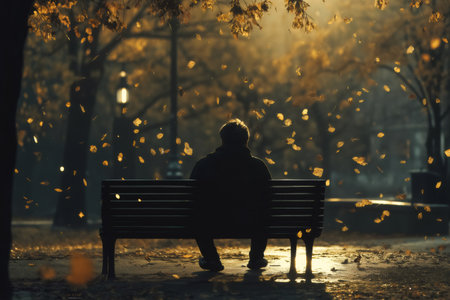 A person sits alone on a bench, their face partially hidden by shadows, as autumn leaves fall around them.