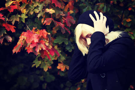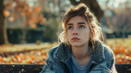 A young woman sits pensively on a bench in an autumn park surrounded by colorful leaves and bare trees.