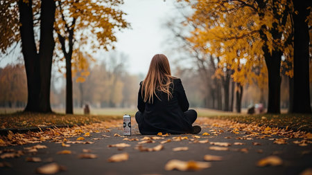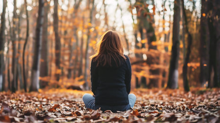 A woman is seen sitting on a pathway with her back to the viewer, surrounded by fall foliage. The image displays a shallow depth of field, with a focus on the subject. Warm autumnal colors dominate, showcasing golden leaves and a soft, diffused lighting. It could be used for various commercial or editorial applications.