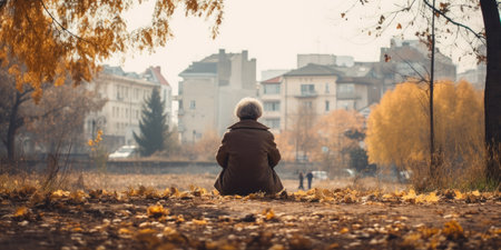 A lonely old woman sitting on the ground in autumn park and looking at the city.