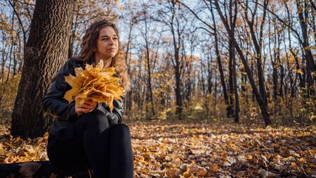 A girl sits on a bench in an autumn park and looks at the falling leaves