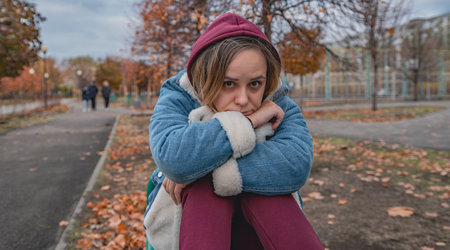 A woman sitting on a park bench, staring into the distance with a worried look.