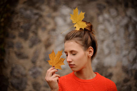 Woman in the orange sweater with the one yellow maple leaf on the head as accessory and holding another. Conception of the autumn coming