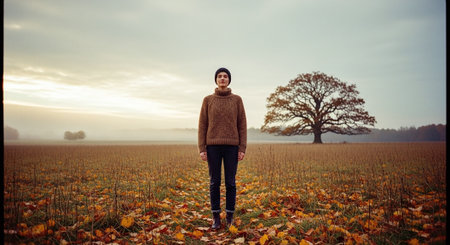 A football coach stands distantly across a wide field, with autumn leaves scattered on the grass. The scene captures poetic sports minimalism in soft, cinematic lighting.