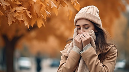 a woman sneezing her nose in the cold weather with autumn leaves on the ground and buildings in the background