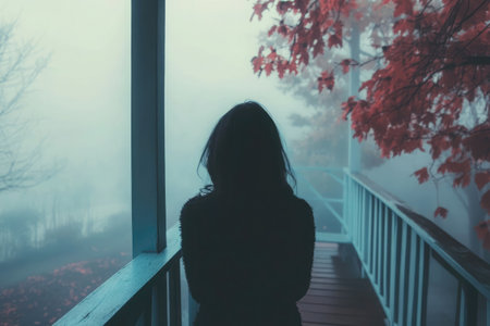 A person standing on a porch surrounded by fog and autumn leaves in a serene setting