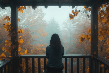 A person enjoys a tranquil moment on a porch surrounded by autumn foliage in a misty forest