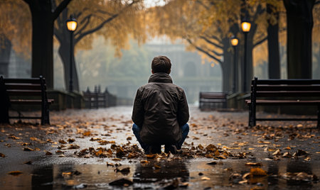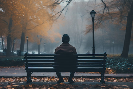A man sitting on a bench in a foggy autumn park, rear view of a solitary person sitting on a bench in an autumn park with trees and bad weather, AI Generated