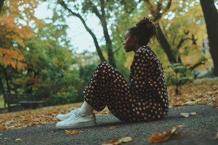 Fashion model sitting on the ground in a park, relaxing amidst colorful autumn leaves and trees, embracing a serene outdoor lifestyle