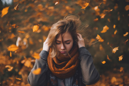 Model adjusting her scarf while posing in a park during a windy autumn day with falling leaves