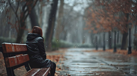 A person sitting alone on a wooden bench in the rain, with water droplets falling around them.