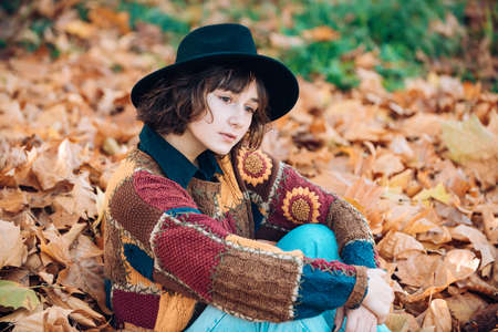 Fashion people. Girl in autumn orange leaves. Outdoor. Young hipster woman in a fashionable knitted sweater while sitting on autumn foliage in the forest.