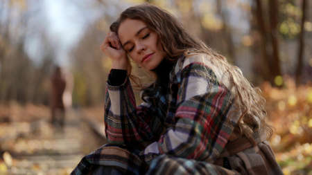 sad abandoned woman is sitting alone on old railway road in autumn, silhouette of walking away man