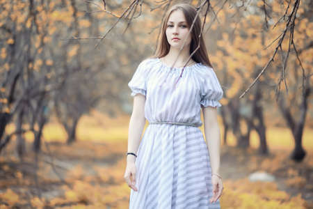 Beautiful girl in a long dress walking in the autumn forest.