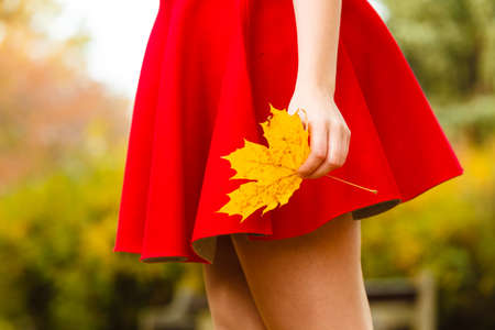 Leisure outdoor relax forest park autumn fall concept. Young lady holding leaf. Girl in park presenting maple foliage.