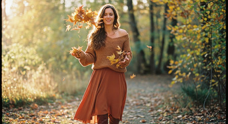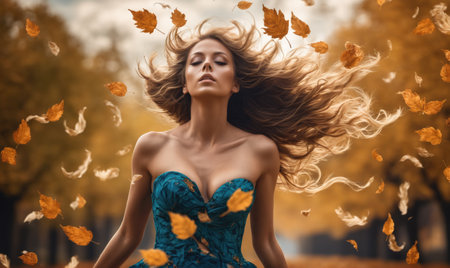 Autumn or fall season. woman in elegant dress with long hair stands by lake, surrounded by autumn leaves. soft light creates dreamy atmosphere as she turns around to show her back and flowing skirt