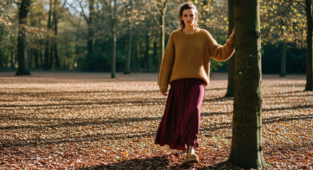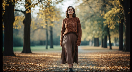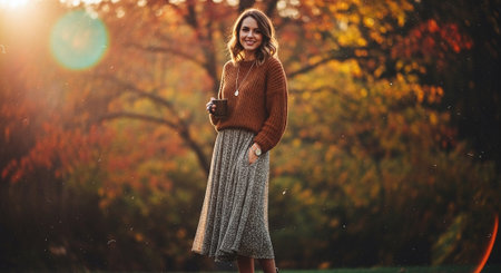Smiling young woman in sweater and skirt standing in autumn park.