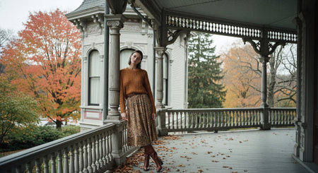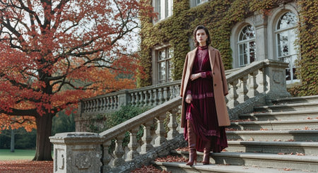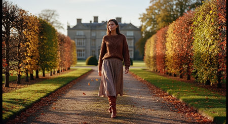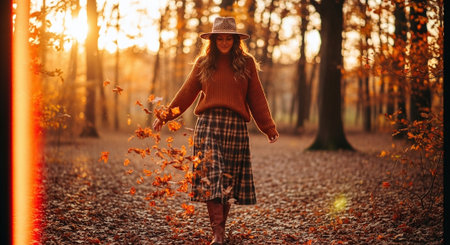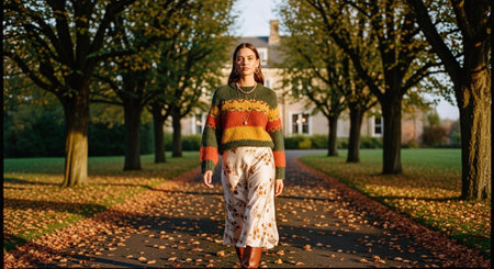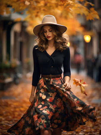 Autumn Stroll in Colorful Dress Along Cobblestone Pathway With Falling Leaves