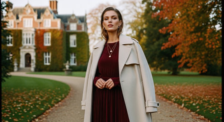 Young woman dressed in autumn coat and red sweater.
