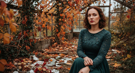 Fashion model sitting on the ground in a park, relaxing amidst colorful autumn leaves and trees, embracing a serene outdoor lifestyle