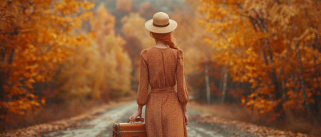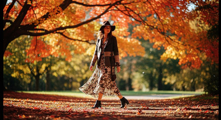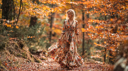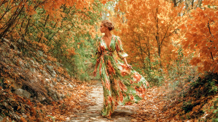 Elegant woman in floral dress walking through autumn forest path surrounded by vibrant orange and golden fall foliage creating magical atmosphere.