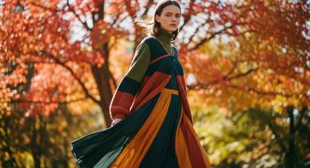 Beautiful young woman in a long colorful dress in the autumn park