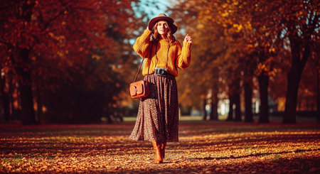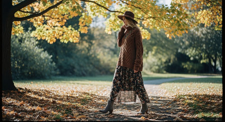 A beautiful young woman in a long skirt and a knitted sweater walks through the autumn park.