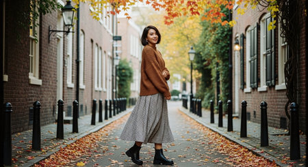 Young woman standing confidently on a tree-lined street during autumn with colorful leaves