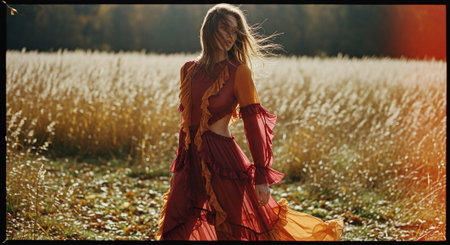Beautiful girl in a long red skirt dancing in the field.